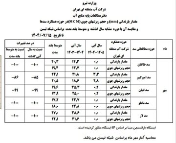 آمار بارندگی در حوضهٔ آبریز ۳ سد تهران شامل سد طالقان، ماملو و لار از ابتدایی مهرماه تا پانزدهم ماه جاری صفر بوده است.