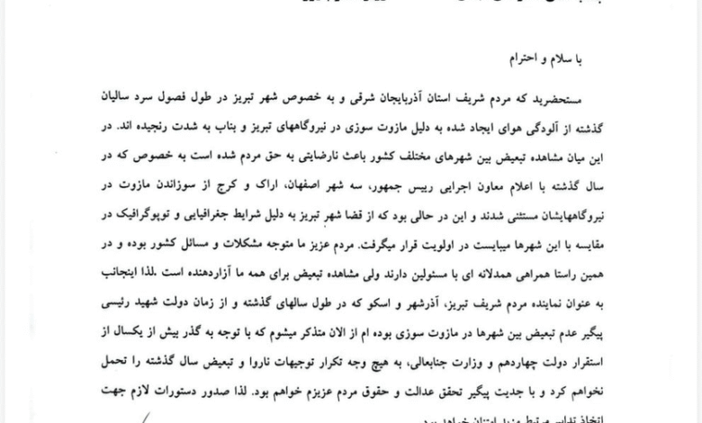 نماینده مردم تبریز در مجلس گفت: هشدار به وزرای نفت و نیرو: تبعیض در مازوت سوزی را نخواهیم پذیرفت.
