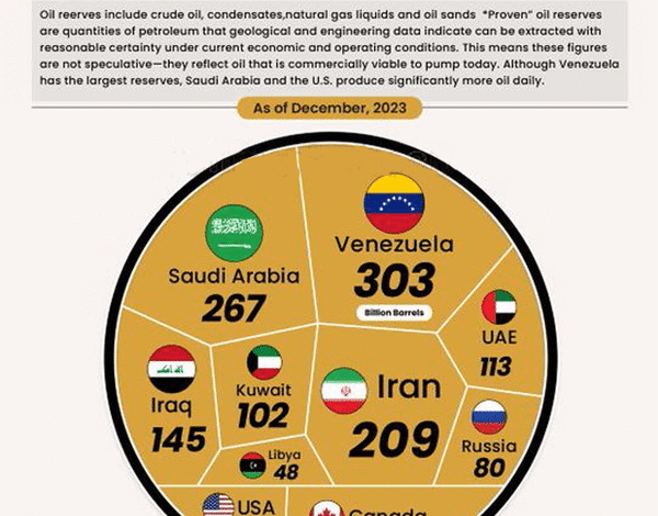 بر اساس تازهترین آمار منتشرشده، چند کشور جهان حدود ۱.۵ تریلیون بشکه نفت در اختیار دارند که بیش از ۹۰ درصد از کل ذخایر قابل استخراج نفت جهان را شامل میشود.این ارقام نشان میدهد که منابع نفتی جهان همچنان در دست تعداد محدودی کشور متمرکز است و نقش حیاتی در بازار جهانی انرژی و تعیین قیمتها دارند.ونزوئلا با ۳۰۳ میلیارد بشکه ذخیره در صدر فهرست قرار دارد، اگرچه تولید روزانه این کشور بسیار کمتر از عربستان سعودی و ایالات متحده است.عربستان سعودی با ۲۶۷ میلیارد بشکه و ایران با ۲۰۹ میلیارد بشکه در ردههای بعدی جای دارند.