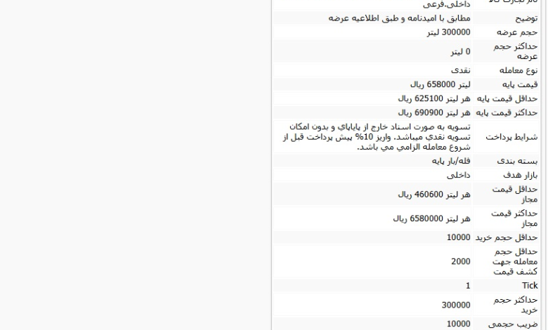 در حالی که سفارش فروش ۳۰۰ هزار لیتر بود، امروز یک فقره سفارش خرید به حجم ۳۰ هزار لیتر و با قیمت پایه ۶۵ هزار و ۸۰۰ تومان به ازای هر لیتر، ثبت شد و به فروش رفت.